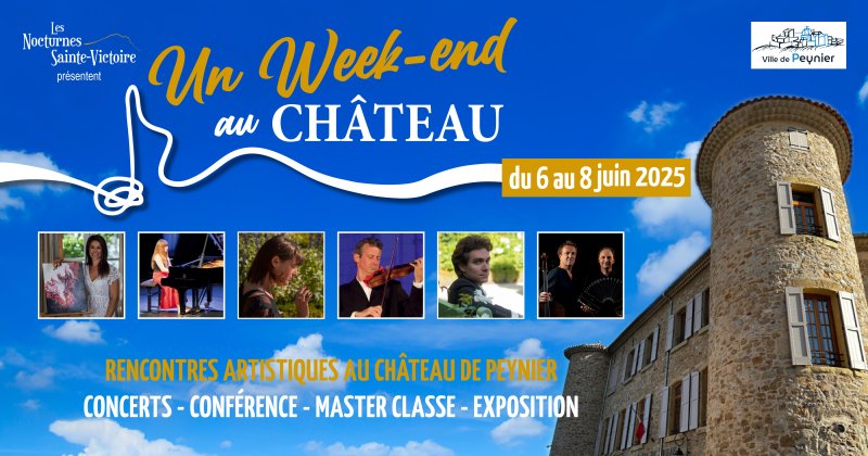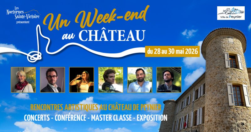 En prélude au festival des Nocturnes Sainte-Victoire, venez découvrir à Peynier notre évènement "Un Week-end au Château". Un Week -end au Château est un évènement culture et patrimoine au cœur de l'écrin somptueux du Château de Peynier, magnifié par une récente restauration. Venez découvrir une exposition de peinture, assister à une conférence, participer à une master-classe de piano dans de ce joyau du XVIe siècle. Profitez de deux concerts exceptionnels dans la somptueuse cour centrale avant de déguster les mets de notre "food-truck" sur la place du village.